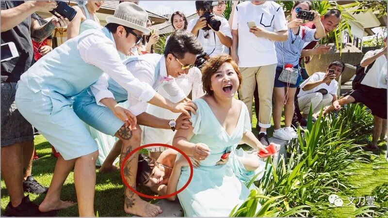 伴郎团一众男艺人拖拽柳岩,试图将她拉进场地的泳池中,