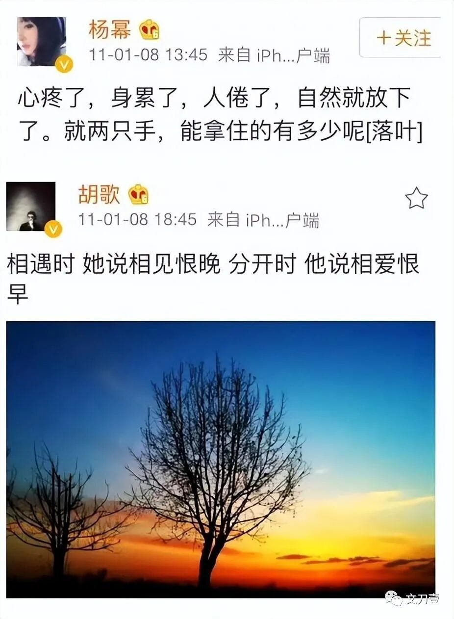 只不过当所有人都以为他们会官宣恋情的时候,2011年的8月,杨幂和胡歌神同步地发布了一个动态,那一刻似乎像在对所有人宣告,两人的关系到此结束。