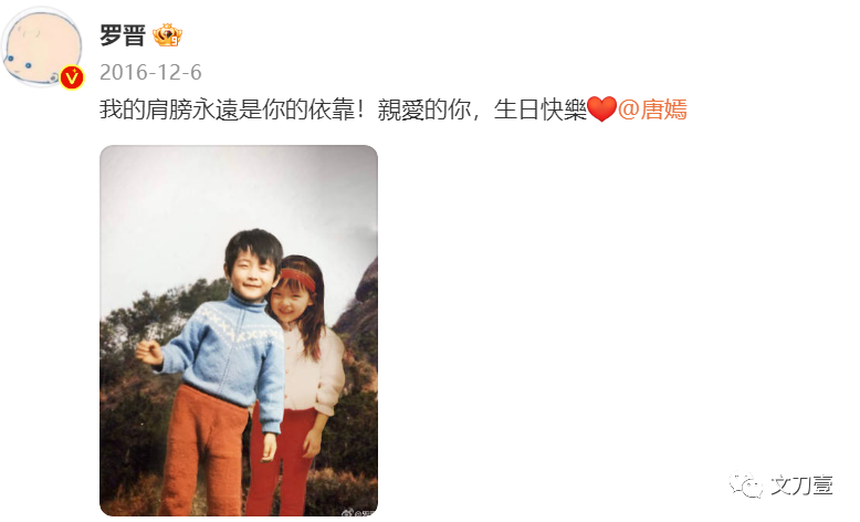 字里行间满满都是爱意,配图里两人小时候的照片被P在一起,“小唐嫣”依偎在“小罗晋”身边,两人笑得天真无邪,颇有种“你的过去我来不及参与,你的未来我奉陪到底”的意味。