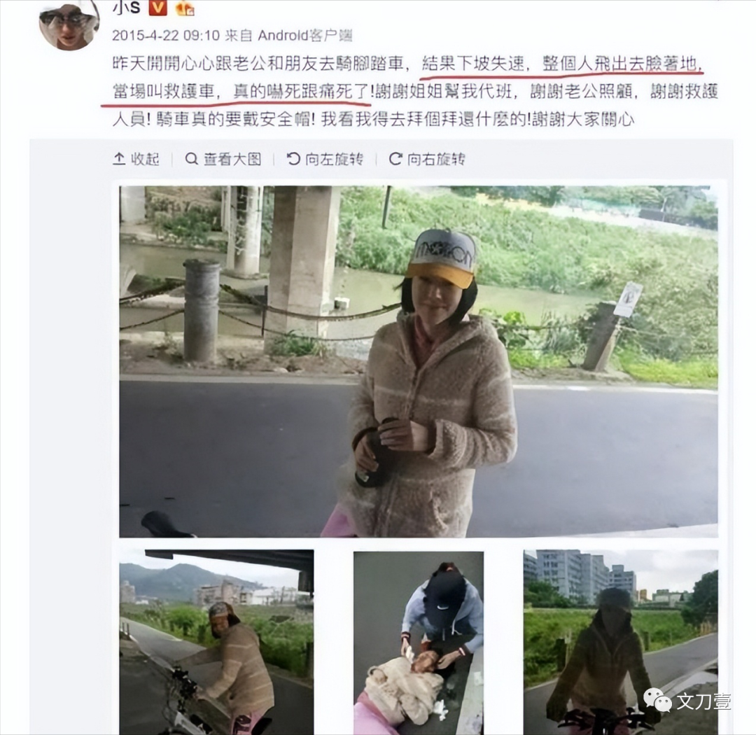她在网上发出,自己是因为骑车和老公出行太开心而摔倒受伤了,于是只好请大s帮自己主持几天。