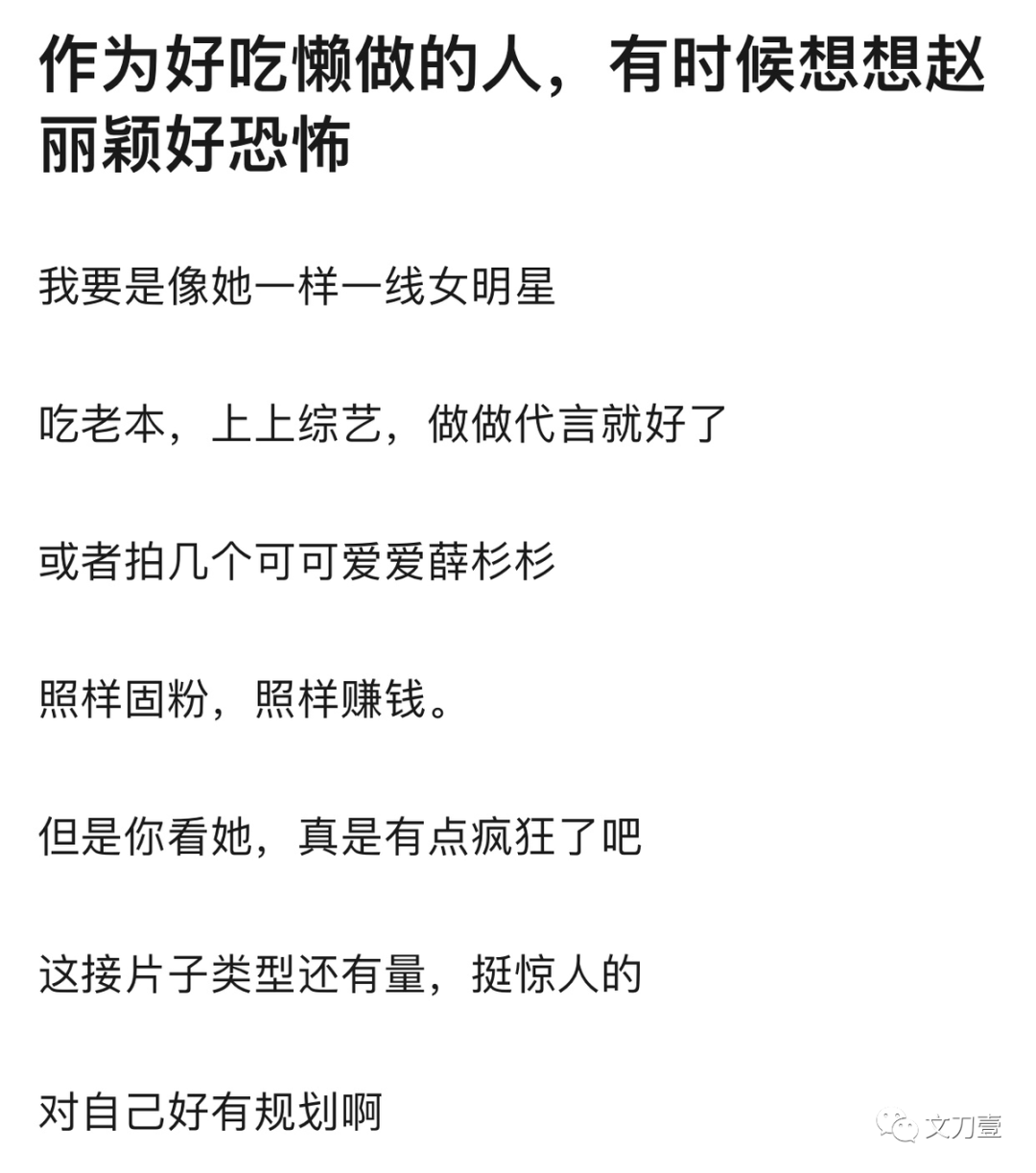“我要是像她一样跻身一线女星,吃老本、上综艺、做做代言就好了,这样照样固粉,照样赚钱。但是你看她,对自己好有规划啊。”