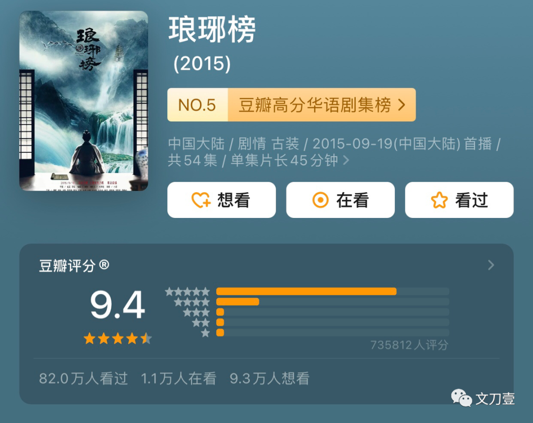 古装电视剧不是没有高分的,但撇去谈情说爱的以外,像《琅琊榜》这般高分又出圈的作品少之又少,拿奖拿到手软的高分、出圈作品,更是凤毛麟角。