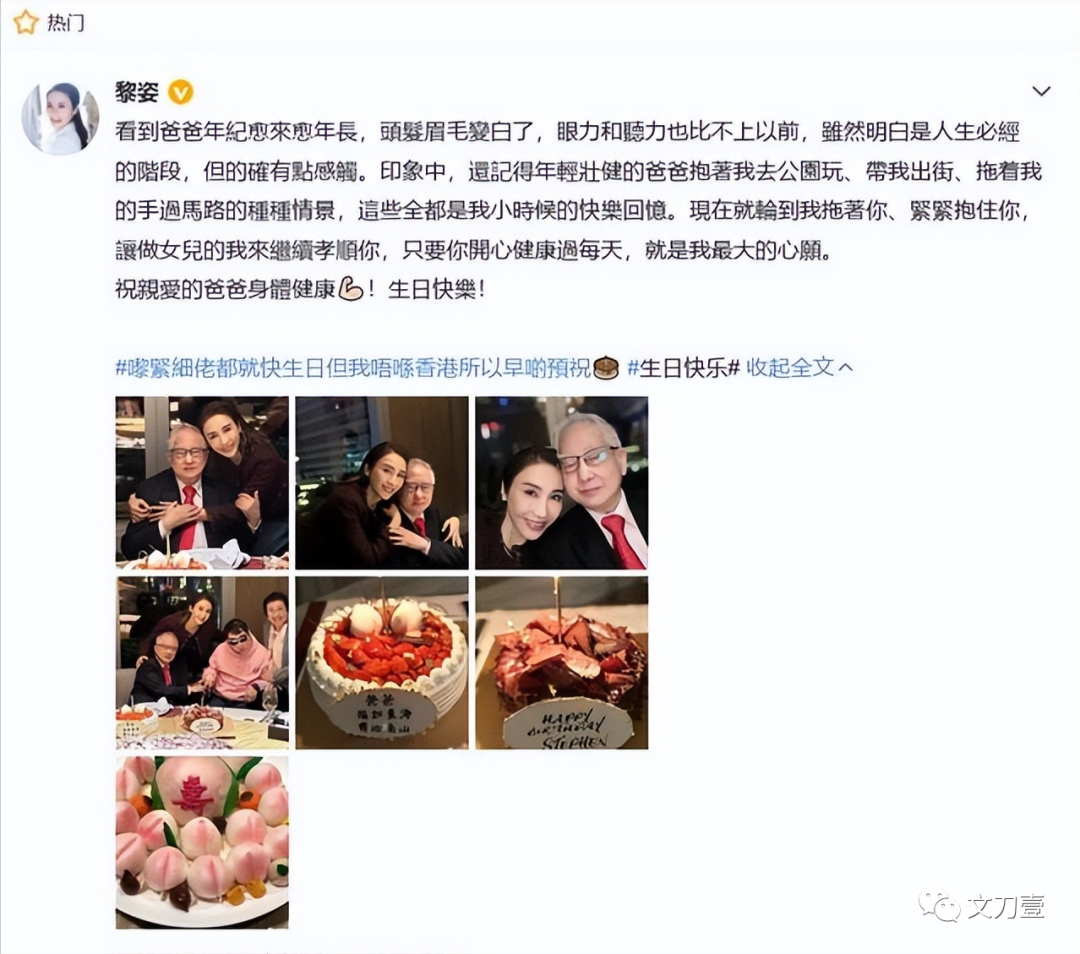 近期,香港女星黎姿在社交平台上发文晒图庆祝父亲的生日。