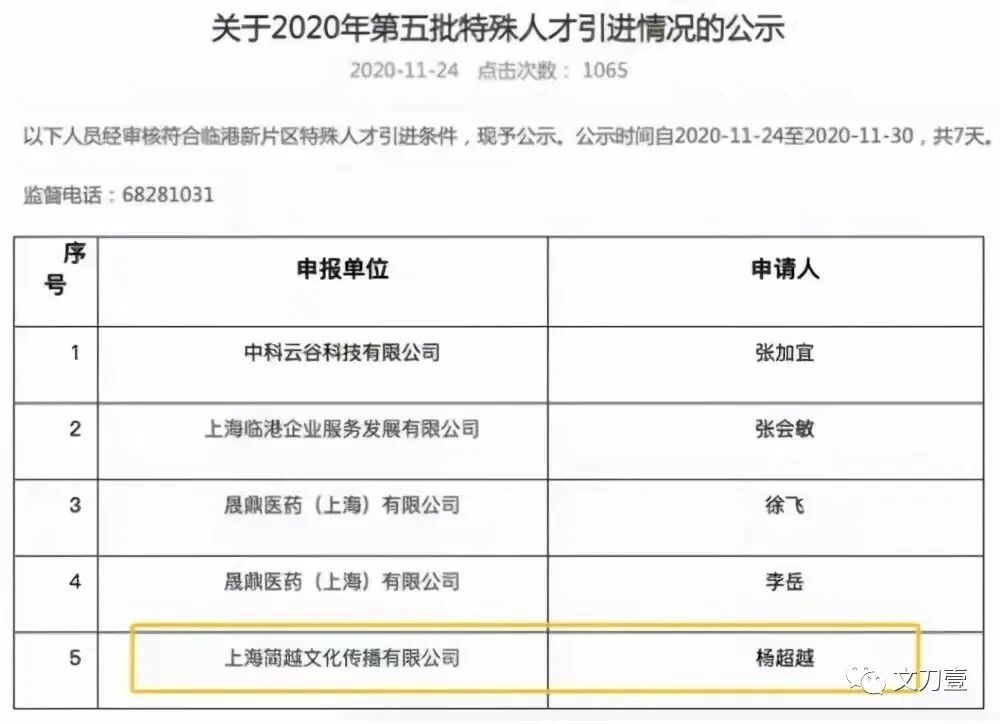 2020年,杨超越以“特殊人才引进”的方式落户上海,