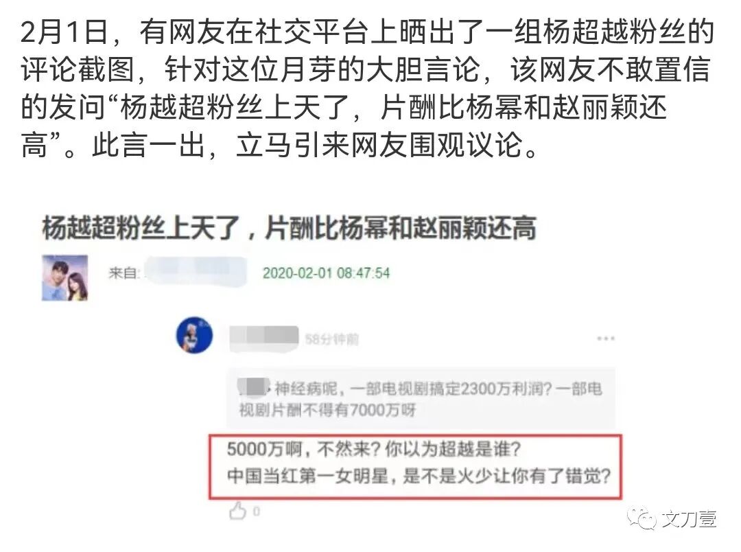 网友在社交平台上晒出了一组杨超越粉丝评论截图,该粉丝大胆发言,杨超越的片酬直达天花板,甚至比前辈杨幂和赵丽颖的片酬都高。