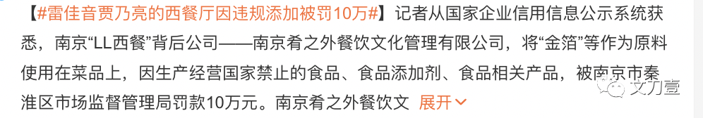 再比如,与雷佳音合作经营的餐厅,因违规在食品当中添加金箔被罚款。