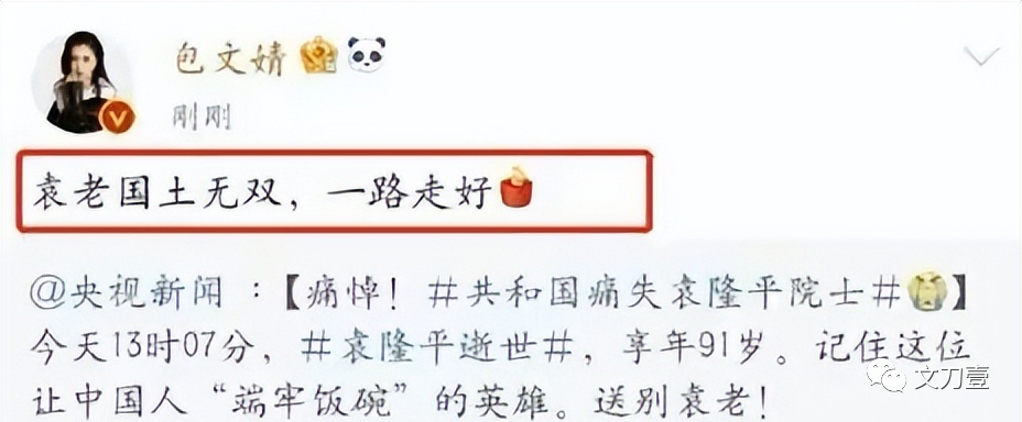 娱乐圈艺人也纷纷发博,悼念“杂交水稻之父”。