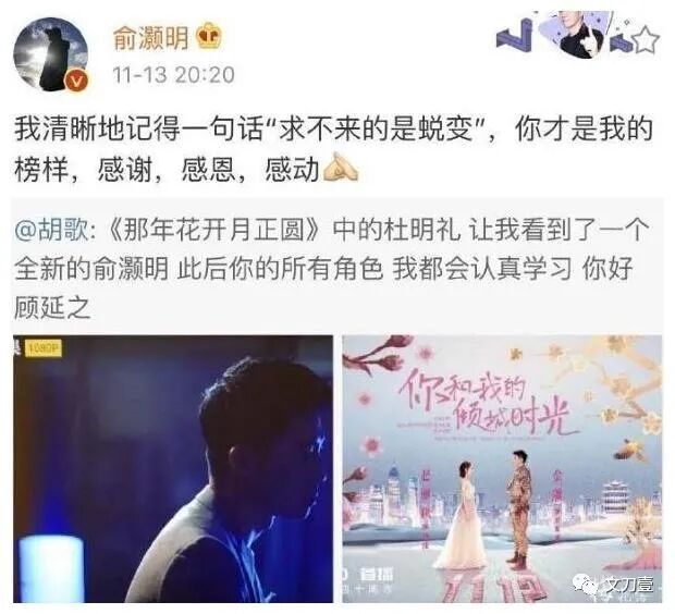 胡歌也会在俞灏明新剧上演的时候亲自下场打CALL。