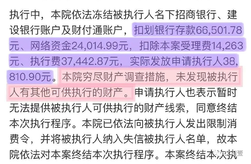 法院调查的结果证据确凿,就只有9万块,即便被列入老赖,黄婷婷也不履行,可以说是单枪匹马对抗资本。