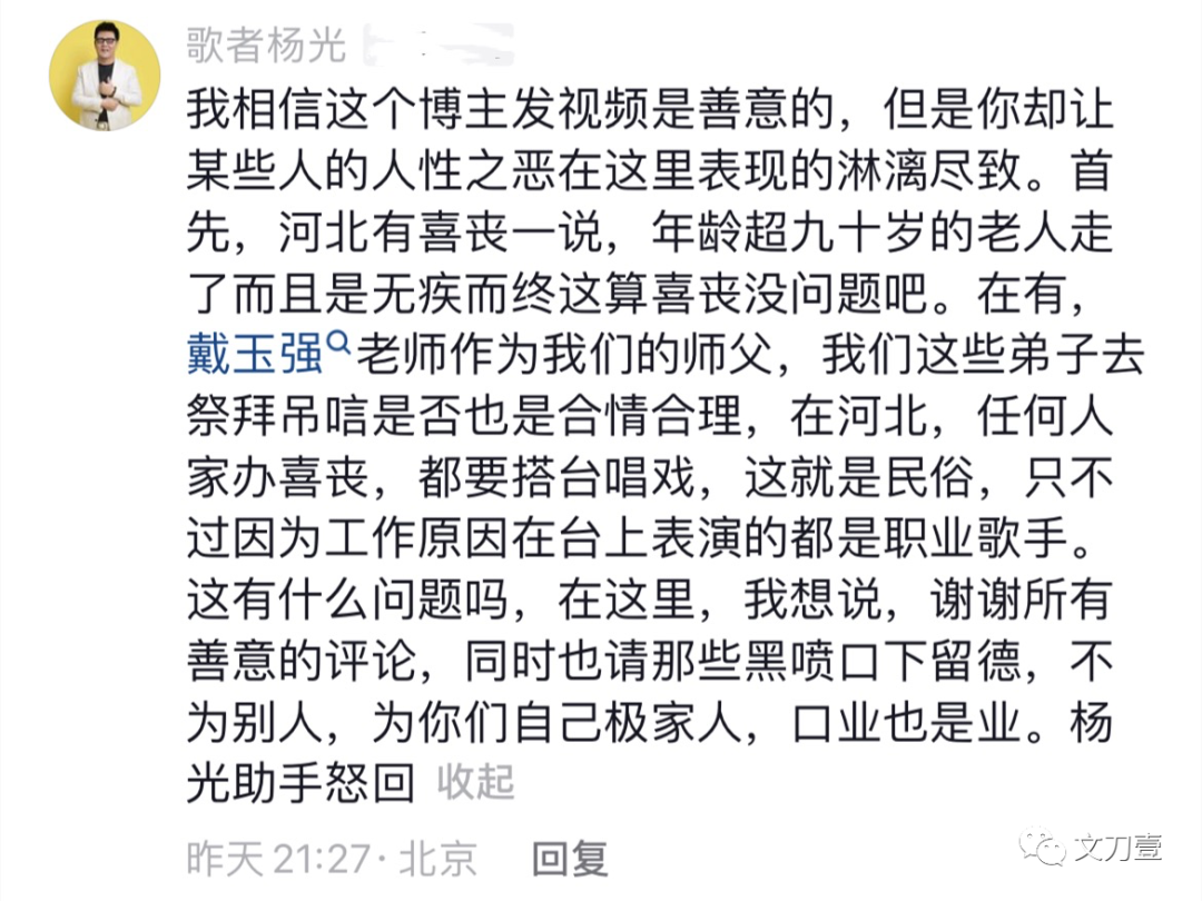 现身葬礼的徒弟之一,歌手杨光了解到了这两天关于师父母亲葬礼的各种评论,对戴玉强各种抨击,忍无可忍亲自回复广大网友。