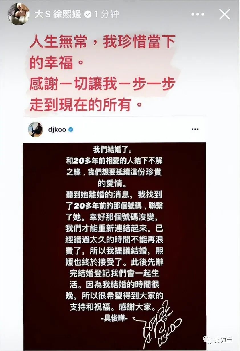 一年后大S转发当年的官宣文案,并且配文:人生无常,我珍惜当下的幸福。感谢一切让我一步一步走到现在的所有。
