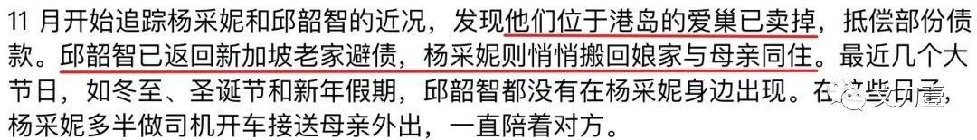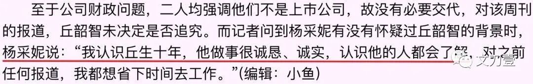 面对外界质疑,杨采妮还是坚信邱韶智:“我认识邱韶智十年,他做事认真诚恳、诚实,认识他的人都了解。”