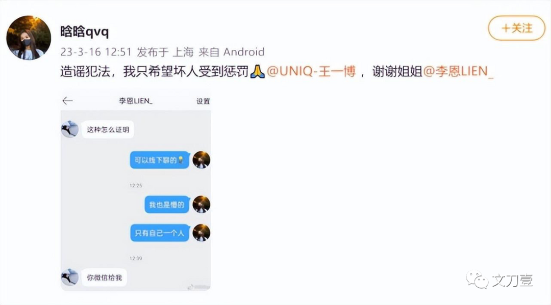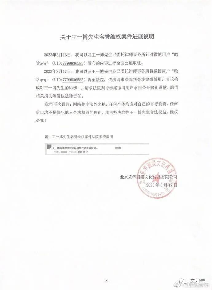 根据王一博工作室发布名誉维权案最新进展,已经对造谣用户“晗晗qvq”采证并提起诉讼,要求造谣用户承担公开赔礼道歉、赔偿相关损失等侵权责任。