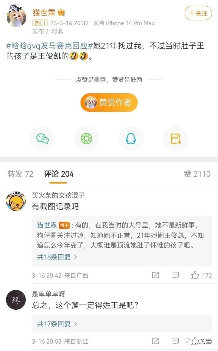 更搞笑的是,这位女网友是惯犯,在王一博之前,她就到处找人爆料,有博主称2年前就被她找过,当时也说自己怀孕,但是肚子里的孩子是王俊凯的。
