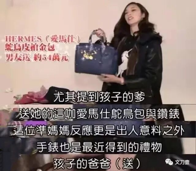 比如,在公众平台上炫富,大晒自己的奢侈品,告诉大众,这是孩子她爹送的。