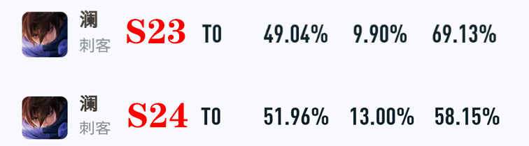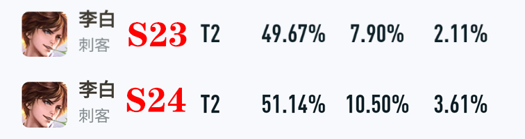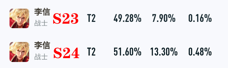 由于时间问题,老王只能制作一个比较简陋的对比图,李信这波大大加强了下限,所以在出场率接近翻倍的情况下,胜率还提高了2.32%,不过缺点依旧明显,所以在巅峰赛上胜率没有多大变化。