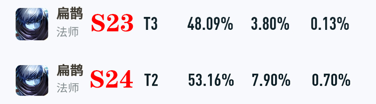出场率直接就翻倍,胜率更是上升了5.07%,虽然扁鹊变强了,但有一点还是要注意,他是一个没有硬控的法师,同时又需要打阵地战,如果队伍里没有硬控前排,拿扁鹊会非常难受。