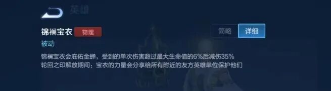 受到的单次伤害超过最大生命值的6%后会减伤35%,开启大招便能将此被动分享给附近队友,金蝉的情况和牛魔差不多,保下C位但C位却啥也不知道。