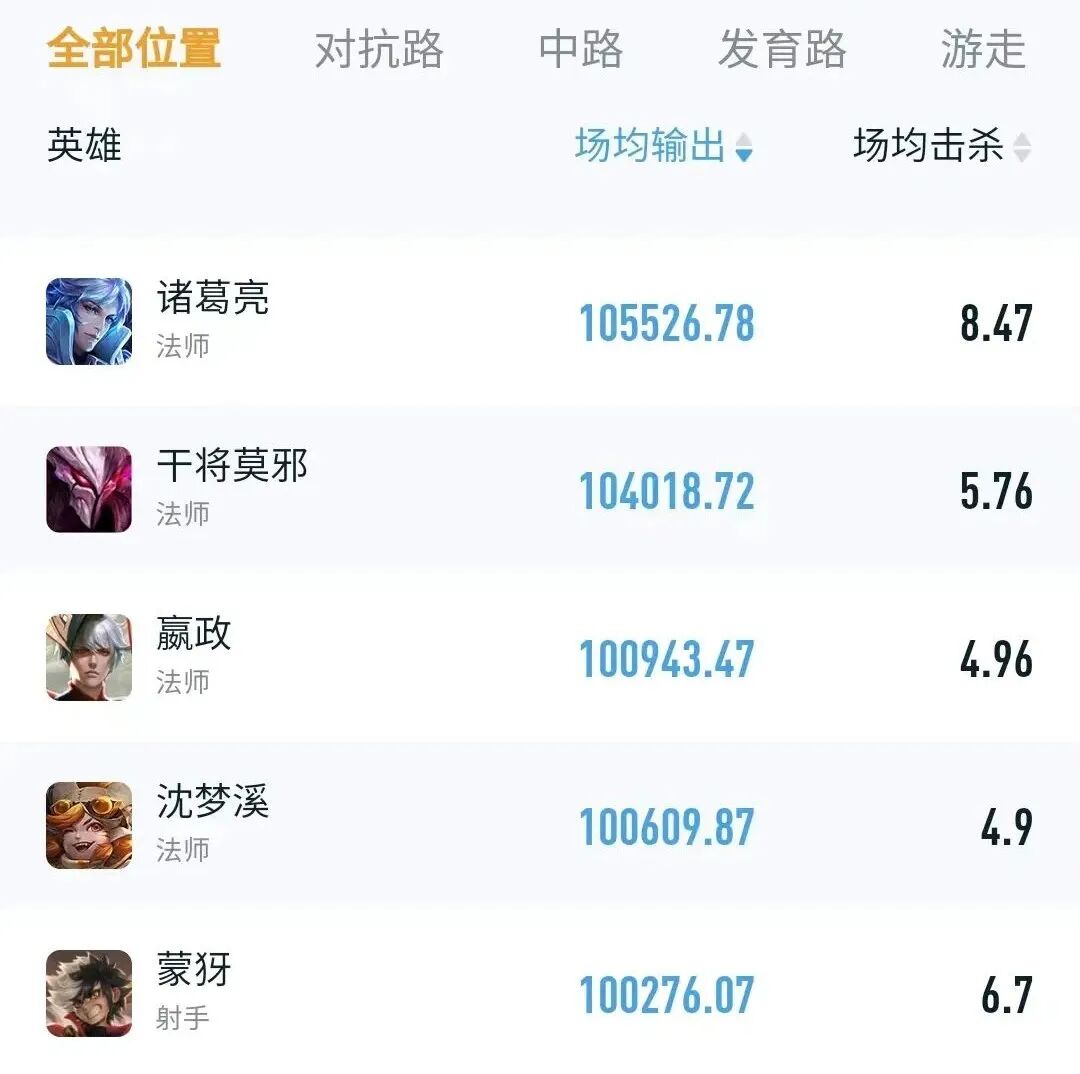 在钻石或者星耀局中,有时候会禁用诸葛亮,打野诸葛亮可以说是虐菜小能手,虽然前期伤害比较低,但抓人时用大招就可以拿到残血人头,经济很容易滚起来,因此他的场均输出也是排在了全英雄的第一位。