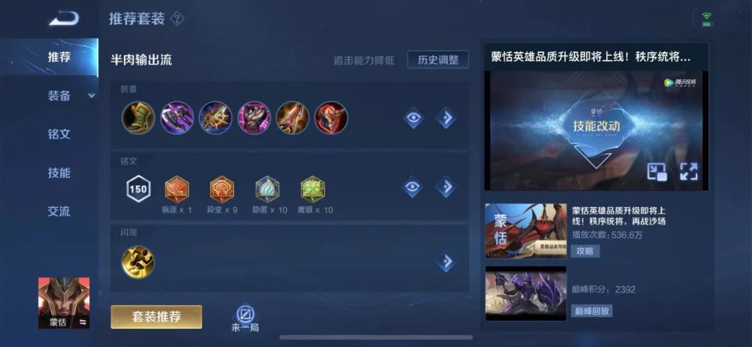 蒙恬大将军经过一轮重做及技能优化后,强度比之前高了不少,进能闪现瞬秒C位,退能防守形态抗下成吨伤害。在吕布凉了之后,蒙恬变成了如今的“边路五五开”,谁来了都能打个有来有回。