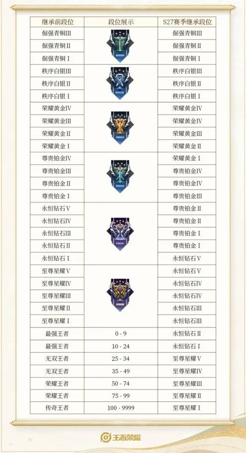 S28赛季的段位继承会沿用本赛季上线的新版继承规则,王者1星回钻2,无双25星回星耀5,荣耀50回星耀3。