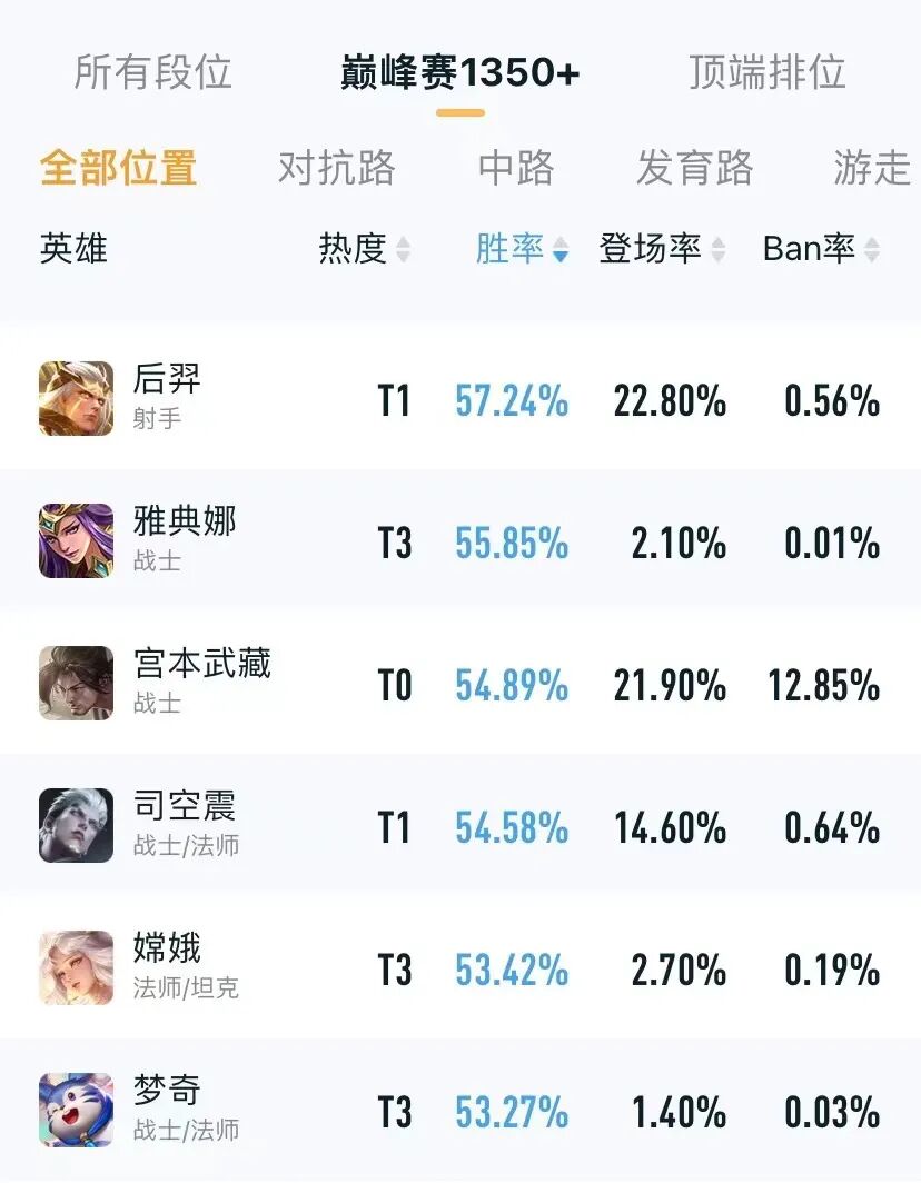 真男人就是经得起考验,后羿在影刃削弱后不仅没有陨落,胜率反而还在继续提升,目前以57%的胜率霸榜了巅峰赛第一,成功把常驻榜首的雅典娜给挤了下去。