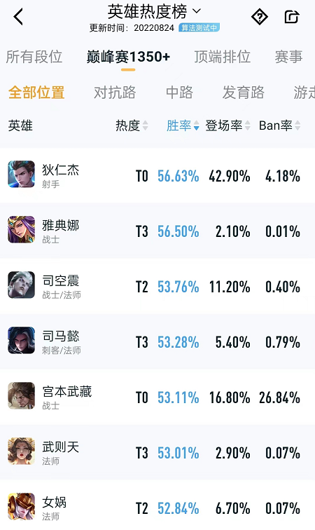 当“法球流”后羿被削后,“法球流”狄仁杰又以56.63%的高胜率压制住常驻在榜首的雅典娜,成功抢夺到了巅峰赛胜率榜第一,由此可见,这个版本强的并不是后羿狄仁杰,而是法球流打法。