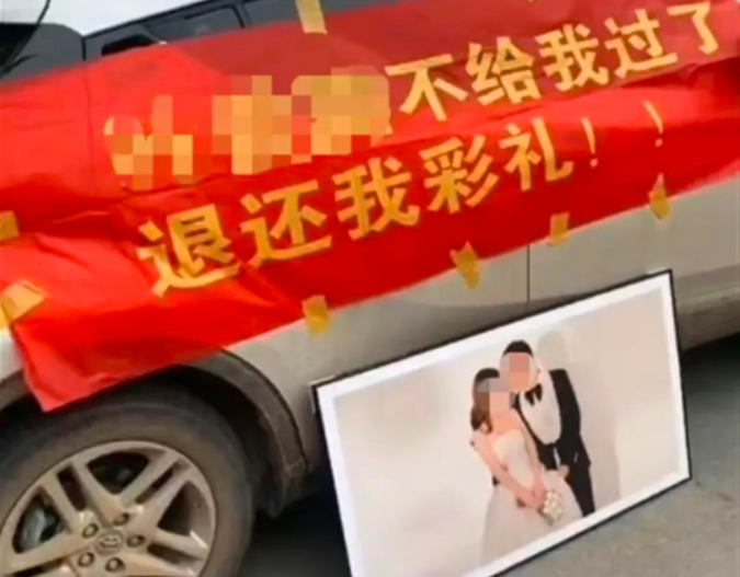 心里窝着火的小李于是拉上横幅,带上大喇叭,来到妻子娘家所在小区,讨要彩礼。
