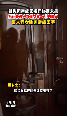 而临沂这位女子就是这个房屋户主的侄女,拆迁办于是就派人轮番在女子家门口敲门,希望能够给女子施加压力,要求侄女去胁迫那个亲戚签字,接受拆迁条件。