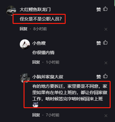 有网友点破其中一二:是不是这个侄女是某个公职人员,因为有些地方搞拆迁,如果家里不同意,那么家里面的成员或者关系密切者会先让这些人回家做工作,什么时候签完字,再允许回去上班。