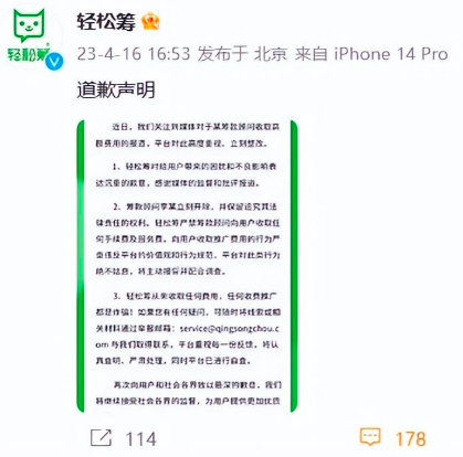 2、轻松筹平台官方发表道歉通告,不但将李某开除,而且有计划追究李某的法律责任。