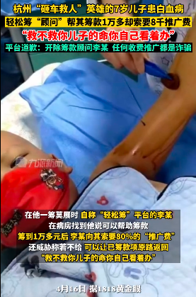 据烟台日报“水母网”的视频报道,来自浙江杭州的陈先生日前曾在轻松筹平台筹集过一笔募捐,主要用于陈先生的儿子治疗白血病。