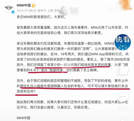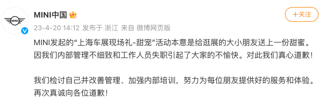 宝马不愧为国际大品牌,很快出了一则道歉信,诚恳不诚恳的先不谈,首先就承认了错误:MINI发起的“上海车展现场礼-甜宠”活动本意是给逛展的大小朋友送上一份甜蜜。因我们内部管理不细致和工作人员失职引起了大家的不愉快。对此我们真心道歉!我们检讨自己并改善管理、加强内部培训,努力为每位朋友提供好的服务和体验。再次真诚向各位道歉!
