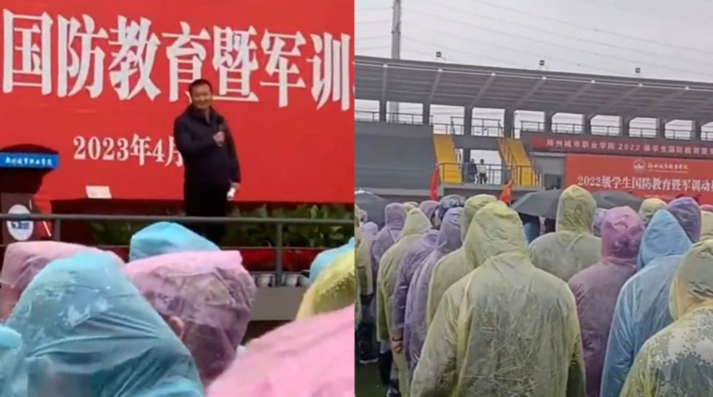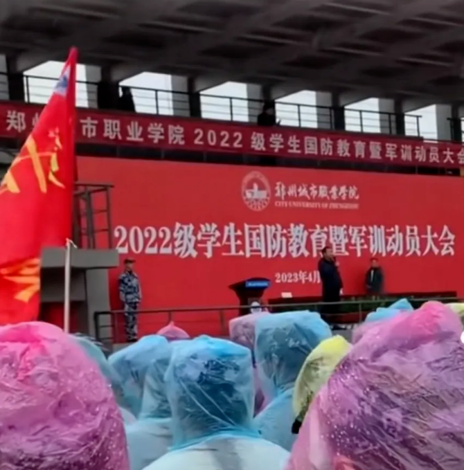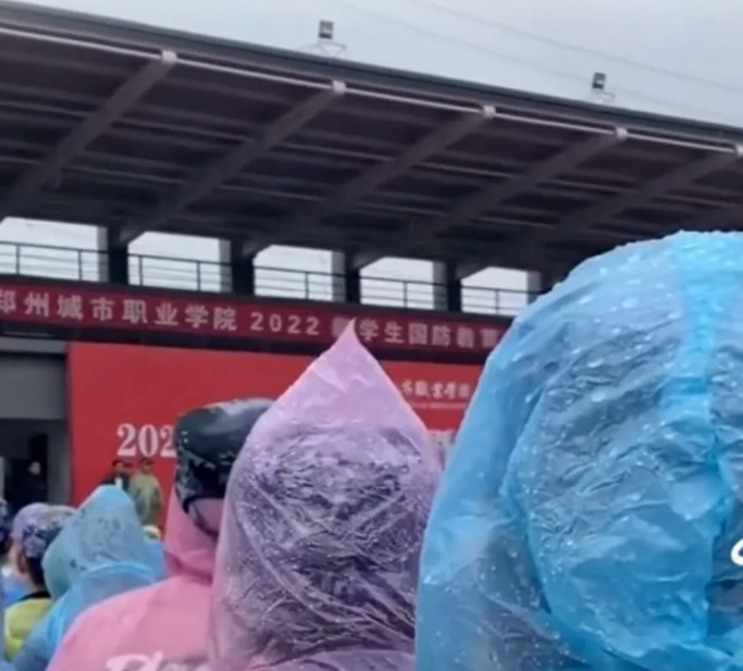 河南郑州一高校,正在操场上给学生们做军训动员。谁料天空不作美,当天阴云密布,下起了大雨。