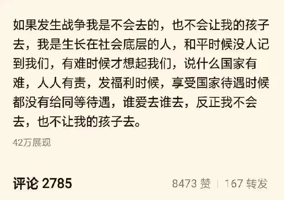 网络上有一种言论获支持度挺高,那就是:如果真的到了危机时刻,他们可以参战,但是必须让端着铁饭碗的富人以及掌权者站出来先冲锋一波,然后再轮到自己。