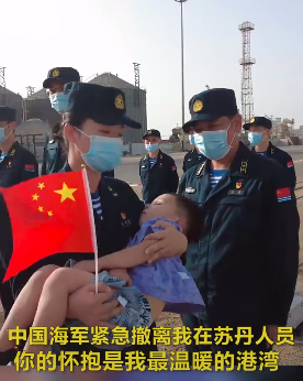 比如前几天的苏丹撤侨,当同胞看到自己的军舰来接他们的时候,小孩子可以安稳的入睡,让解放军姐姐抱着登上舰艇。