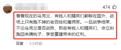 “有钱人和精英们都躲在国外,战场上只有跑不掉的老百姓和雇佣军。一旦战争结束,不论乌克兰是否战败,那些有钱人和精英们,会立刻跑回来摘桃子,享受重建带来的红利。”