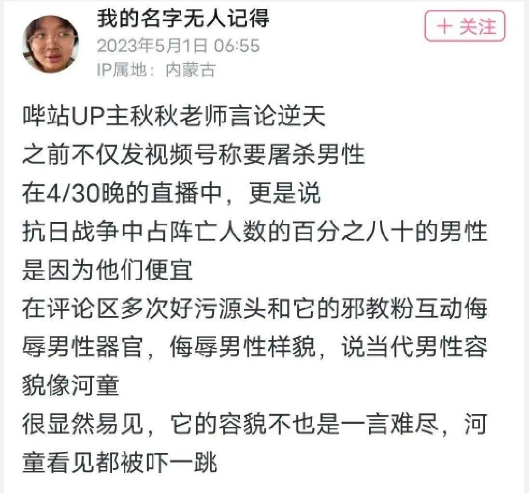 “之前不仅发视频号,称要屠杀男性,多次侮辱男性器官,侮辱男性样貌,说当代男性样貌像河童。”