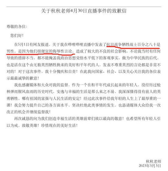 5月3日,B站一个女主播“秋秋老师”因为之前的侮辱抗战英雄的言论,写了一份道歉信,祈求获得大家的原谅,并希望能够给她一次改过自新的机会。