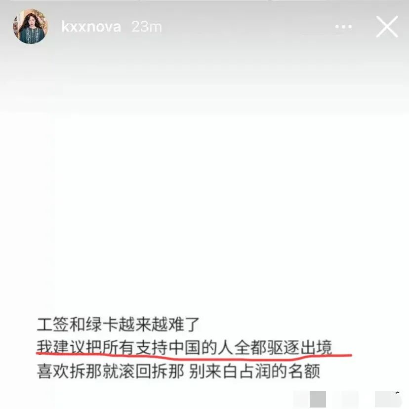 由于出国的工签和绿卡越来越难通过,她又说建议把所有支持中国的人驱逐出境,别占用那些想走的人的名额。