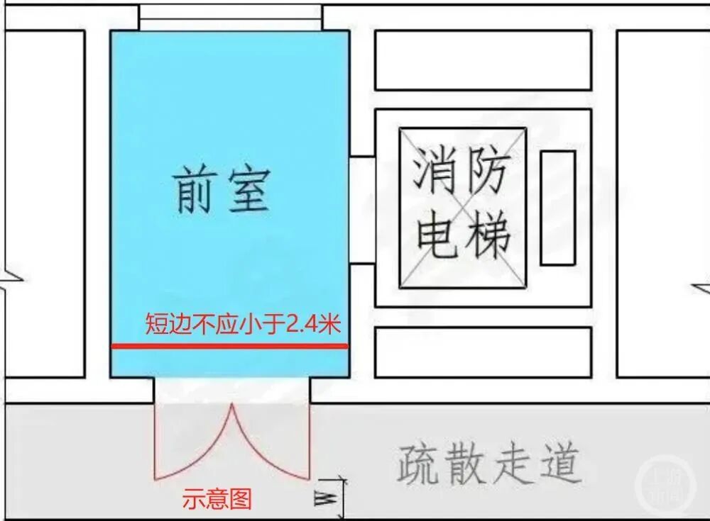简单来说,就是消防电梯出口的空间面积,最窄的一条边,它的长度不应小于2.4米,一旦小于这个尺寸,很多消防或者急救设备就无法顺利进出。