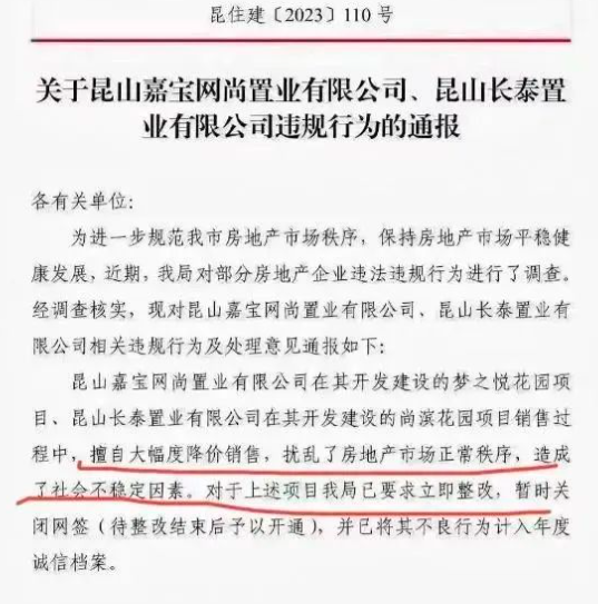 根据昆山市住房和城乡建设局的(2023)110号文件写道:“擅自大幅度降价销售,扰乱了房地产市场正常秩序,造成了社会不稳定因素,对于上述项目我局已要求立即整改,暂时关闭网签,并已将其不良行为计入年度诚信档案。”