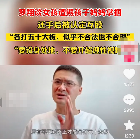 著名的“法外狂徒张三”罗翔老师也分享了自己的看法:“只有不正对不正,才能各打五十大板。但是我们都是普通人,一个熊孩子不停的踹你坐椅靠背,在你制止之后,反而遭到孩子母亲的辱骂和掌掴,你会如何反应呢?难道是冷静理性的等待警察的处理?或者充钱去问人工智能?”