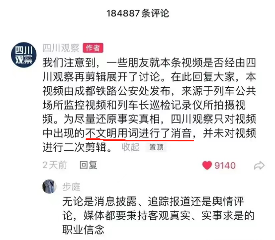 还有一种可能就是,孩子大人那一边骂人时说出来的词汇,属于极其低俗的敏感词汇,即便原封不动的公布出来,也会被一些视频平台给屏蔽。所以,成都铁路也好,四川观察也好,都必须适当的做一些处理。这种情况就像给视频打马赛克的功能是一样的。