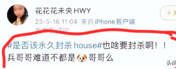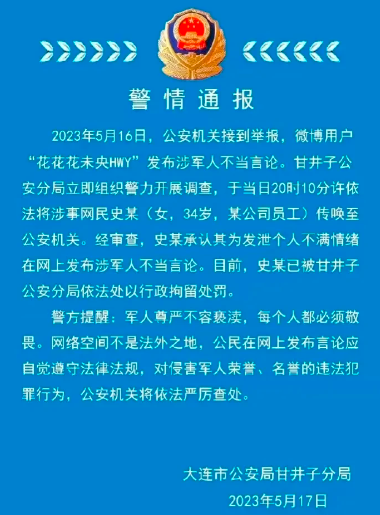 5月17日,大连市公安局甘井子公安分局通报一条警讯通报,经过调查,一个微博用户名称为“花花花未央HWY”在讨论脱口秀演员house一事上,发表涉及军人的不当言论,被行政拘留。