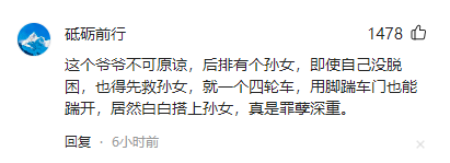 “这个爷爷不可原谅,后排有个孙女,即使自己没脱困,也得先救孙女,就一个四轮车,用脚踹车门也能踹开,居然白白搭上孙女,真是罪孽深重。”