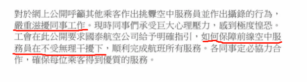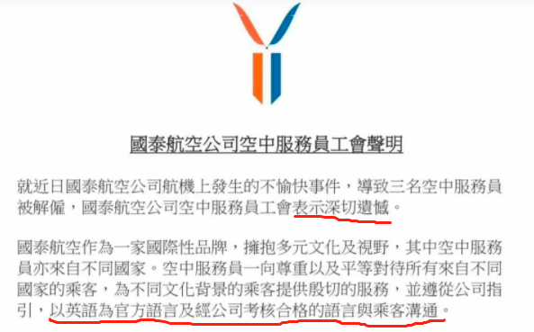 工会声明内容里首先就指出了一点,以英语作为官方语言是遵从了公司的指引和考核。也就是说,用英语服务乘客,是经过公司的培训和领导要求下的行为,并不是员工自己主观行为,老板让我们用英语服务客人,那我们只能听老板的。