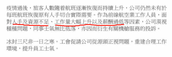 接下来,声明里谈到,之所以产生这样的局面,是因为员工的工资待遇太低,人手不够,导致员工的工作压力大,士气低落,由此增加了大量有关机舱服务方面的投诉。尤其是疫情结束之后,旅客人数持续上升,但是公司没有及时填补前线航空服务人员,让他们工作量大幅上升。
