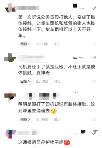 视频内容明明显示的就是城管单方面殴打货车司机,可是通报内容却写的是肢体接触!这样的措辞立刻引起了网友们的热议!