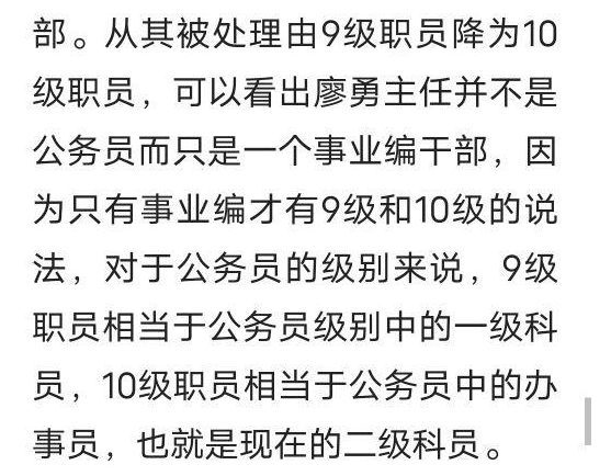 有个昵称为山中老狼的网友从廖勇主任的处罚单里分析,廖主任并不是公务员,而是一个事业编干部,因为只有事业编才有9级和10级的说法,当下的这个惩罚力度,已经算是最大的了,基本上属于一抹到底。